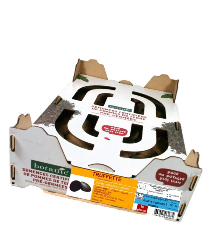 | Conseils d’entretien | A conserver au dessus de 1 C°. 1 – La préparation du sol La pomme de terre aime un sol riche, humide et bien aéré : en automne travailler le sol pour l’ameublir et apporter du fumier ou du compost. 2 – La plantation Planter dans un sol suffisamment réchauffé (10°c) dans des sillons de 5 cm de profondeur avec les distances adaptées aux variétés : Précoces : 65 cm entre les rangs, 35 cm entre les plants. Tardives : 70 cm entre les rangs, 40 cm entre les plants. 3 – La culture Il est important de butter les pommes de terre en début de végétation et continuer régulièrement jusqu’à ce que la plante ait une hauteur de 15 à 20 cm. La pomme de terre a besoin d’un climat équilibré . penser à l’arroser régulièrement, sans excès cependant. 4 – La récolte & la conservation Attendre la période de maturité complète de la pomme de terre. Etaler les tubercules dans un lieu bien aéré et sombre à l’abri du gel. Consommer les pommes de terre dans la période de conservation recommandée pour bénéficier de toutes les qualités gustatives de la variété.