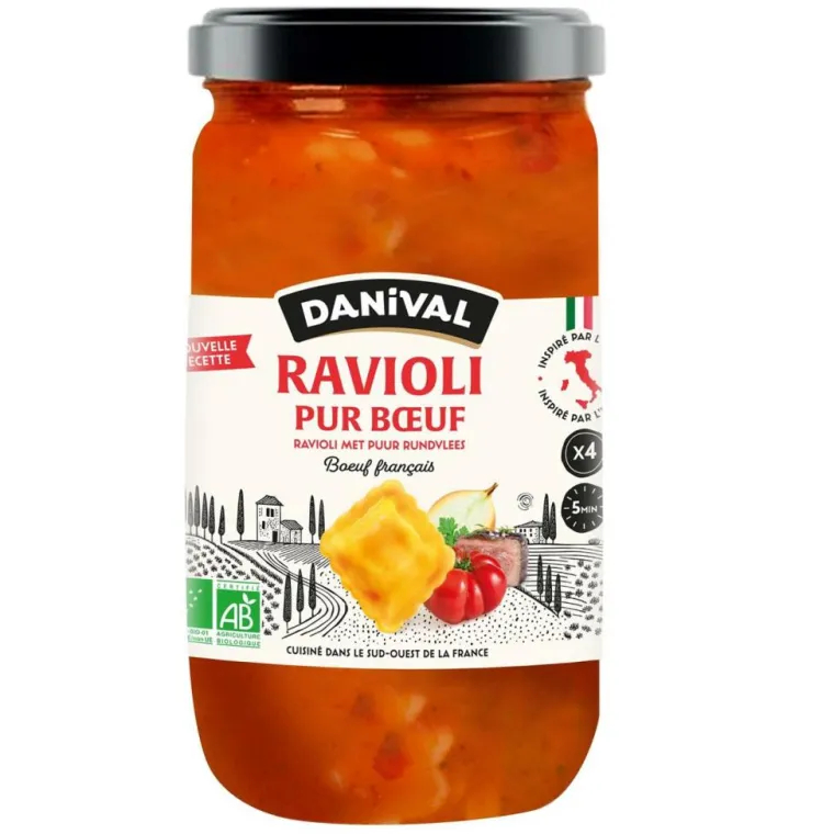 | Composition | Tomates (concentré de tomates et pulpe, eau, ravioli au bœuf (pâte : semoule de blé dur, eau, œufs – Farce : viandre de bœuf, chapelure, semoule de blé, oignons, carottes, poivrons, sel, ail, poivre), oignons, viande de bœuf, sirop de riz, carottes, huile de tournesol désodorisée, sel marin non raffiné de l’Atlantique, ail, épaississant : amidon de maïs, persil, thym, poivre