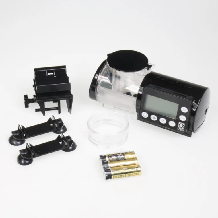 | Conseils d’entretien | Prise d’air pour séchage de la nourriture, fixation universelle par ventouses ou par support à vis de serrage (rotation à 360° sur le support). Contenu : distributeur automatique de nourriture pour poissons d’aquarium avec supports, trois piles AA de 1,5 V et bague d’adaptation pour boîtes JBL PRONOVO de 250 ml.