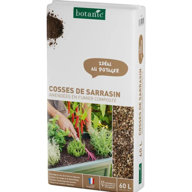 | Conseils d’entretien | Fruits et légumes du potagerDésherber et griffer le sol. Préparer le sol à la fourche de jardin. Epandre de la terre de plantation de façon régulière sur l’ensemble de la surface. Effectuer vos plantations.Ajouter les cosses de sarrasin amendées botanic® sur une épaisseur de 4 à 6 cm.Arroser le paillage de manière à le fixer, les cosses forment ainsi une couverture protectrice, résistante au vent et au piétinement.En fin de culture, incorporer les cosses de sarrasin à la terre, elles permettent la fertilisation du sol.