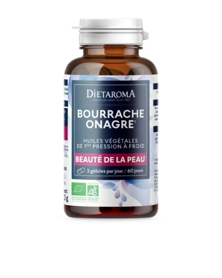 | Composition | Huile de graine d’onagre* (Oenothera biennis), huile de graine de bourrache * (Borago officinalis), gélule végétale (hydroxypropylméthylcellulose (HPMC)), antioxydant : extrait riche en tocophérol (vitamine E).