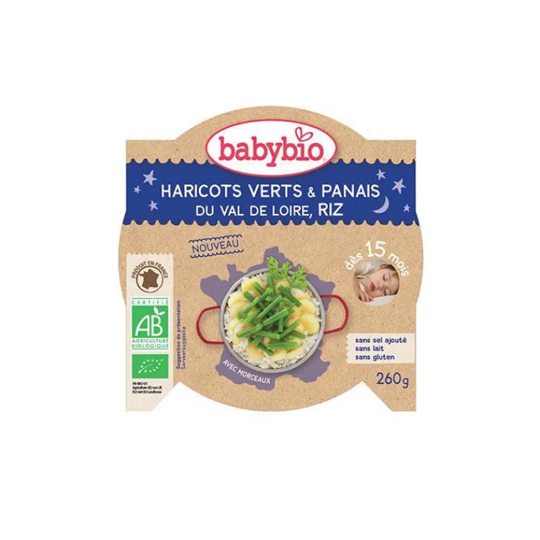 | Composition | Panais du Val de Loire* 37%, haricots verts de Vendée* 30%, eau de cuisson, oignons d’Espagne*, riz* 4%, huiles végétales* (colza*, tournesol*), thym de France*. * Ingrédients issus de l’agriculture biologique