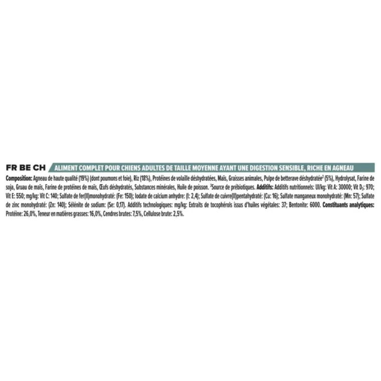 | Composition | Composition : Agneau (19%), maïs, protéines de volaille déshydratées, gruaux de maïs, riz (8%), pulpe de betterave déshydratée, graisse animale, gluten de maïs, hydrolysat, œufs déshydratés, sels minéraux, farine de soja, huile de poisson.