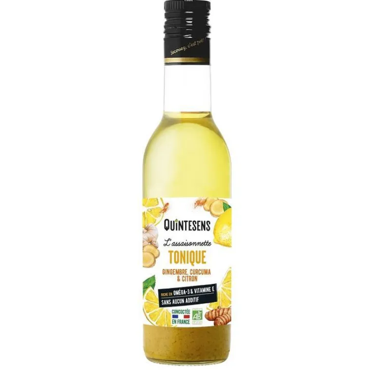 | Composition | Huile de colza* (40%), eau, huile de tournesol* (10%), vinaigre de cidre*, MOUTARDE de Dijon* (graines de MOUTARDE*, vinaigre d’alcool*, eau, sel), gingembre* (2%), citron* (1,6%), curcuma* (1%), persil*, sel, huile essentielle de citron zeste*.
