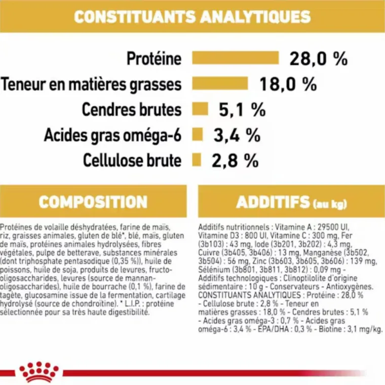 | Composition | Composition isolat de proteines vegetales*, farine de ble, poissons deshydrates, riz, graisses animales, proteines de volaille deshydratees, hydrolysat de proteines animales, gluten de maïs, farine de maïs, fibres vegetales, pulpe de chicoree, sels mineraux, huile de soja, huile de poisson, fructo-oligosaccharides (0,3%), teguments et graines de psyllium (0.2%).