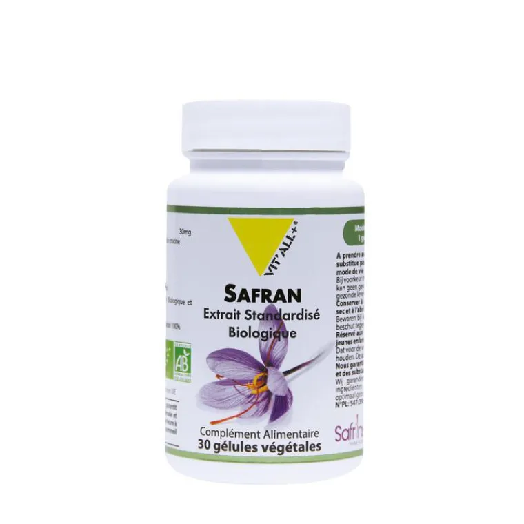 | Composition | Safran (Crocus sativus L.) – Partie rouge des stigmates – Safr’InsideTM Extrait Standardisé à 2 % de Safranal et 3% Crocine 30.00mg