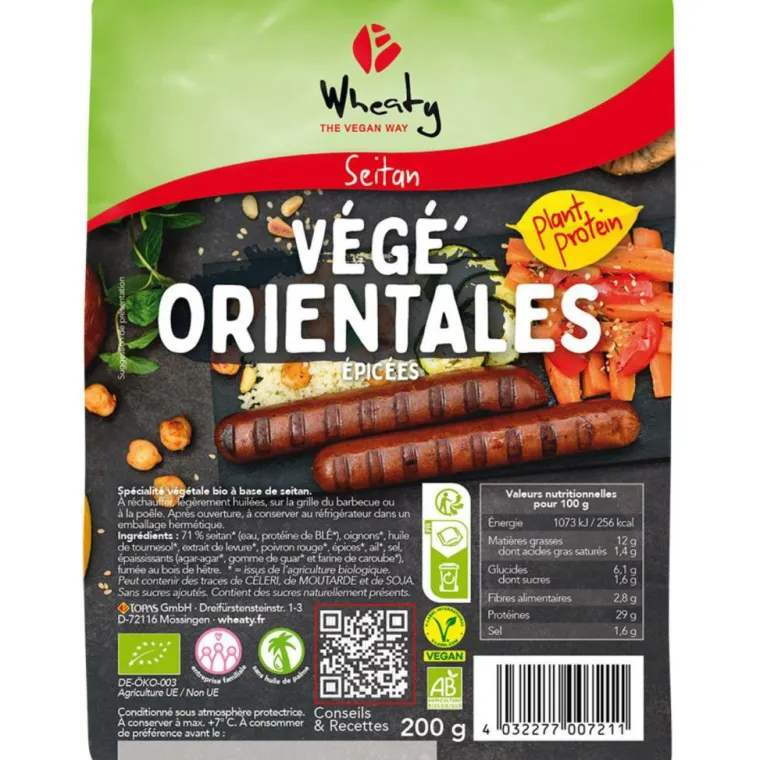 | Composition | seitan* (eau, protéine de BLÉ*) 72%, oignons*, huile de tournesol*, épices*, poivron rouge*, extrait de levure*, sel, épaississant: agar-agar*, gomme de guar* et farine de caroube*, fumée*au bois de hêtre.