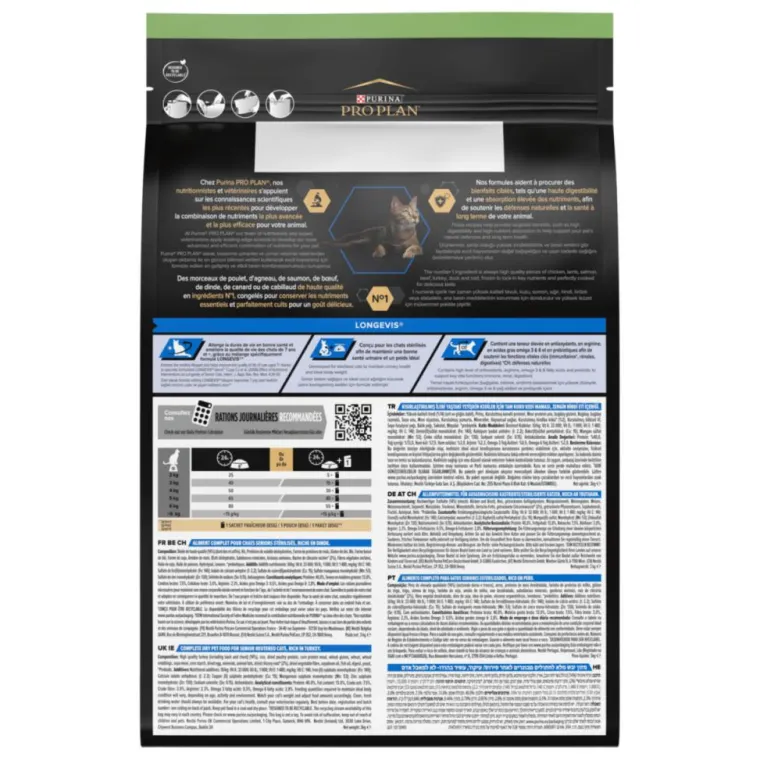 | Conseils d’entretien | Les rations journalières nécessaires pour maintenir une masse corporelle idéale varient en fonction de l’âge, de l’activité et de l’environnement de votre chat. Surveillez le poids de votre chat et adaptez en conséquence la quantité de nourriture. Servir à température ambiante. De l’eau propre et fraîche doit toujours être disponible. Pour la santé de votre chat, consultez régulièrement votre vétérinaire.Rations journalières recommandées (g/jour) :Poids du chat : 2 à 4 kg . quantité : 30 à 60 gPoids du chat : 4 à 6 kg . quantité : 60 à 90 gPoids du chat : 6 à 8 kg . quantité : 90 à 120 g.