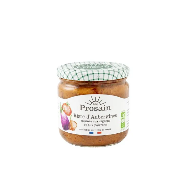 | Composition | Aubergines* en tranches frites 54%, pulpe de tomate* 30%, oignons* 8%, huile de tournesol* désodorisée, poivrons rouges*, sirop de riz*, ail *, huile d’olive* vierge extra extraite à froid, sel de mer, jus concentré de citron*, thym *, poivre*.