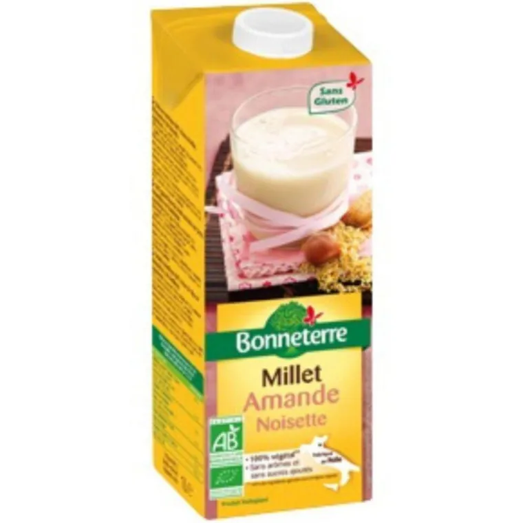 | Composition | Eau, millet* (15%), amande* (2%), noisette* (1%), huile de tournesol pressée à froid*, sel marin. * Ingrédients issus de l’agriculture biologique.