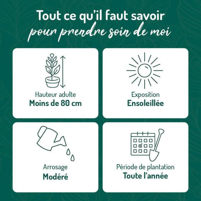 | Type de sol | UTILISER UN TERREAU POUR ARBUSTES, ADAPTÉ AUX SOLS SECS
