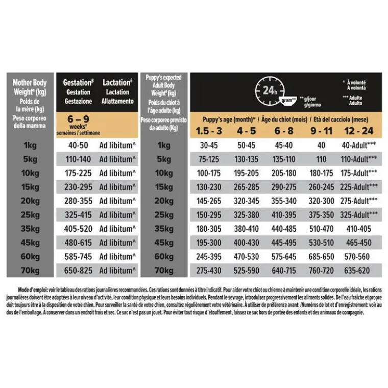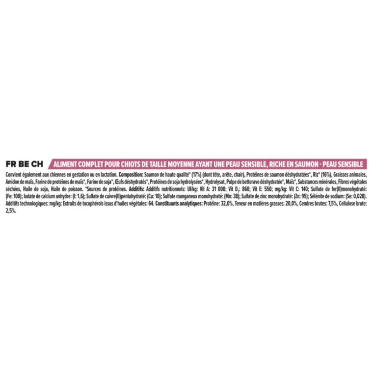 | Composition | COMPOSITION : Saumon* (17%), protéines de saumon déshydratées*, riz* (16%), graisse animale, amidon de maïs, gluten de maïs*, farine de soja*, protéines de soja déshydratées*, œuf déshydraté*, hydrolysat, pulpe de betterave déshydratée*, sels minéraux, maïs*, cellulose, huile de soja, huile de poisson.* Sources de protéines