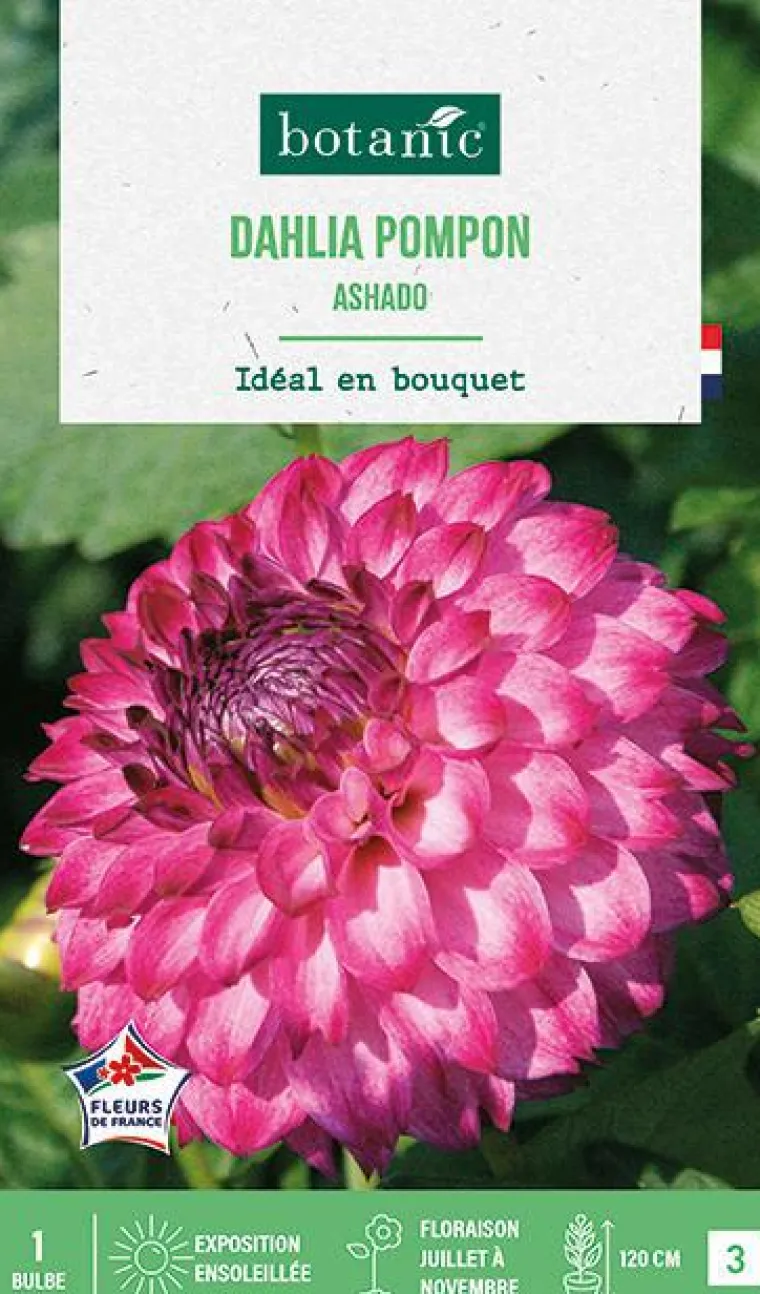 | Conseils d’entretien | Choisissez un emplacement ensoleillé dans un sol riche et bien drainé. Les bulbes de dahlias se plantent après les fortes gelées. Dans un sol ameubli, placez un tuteur au centre d’une cuvette de Ø 40 cm puis le bulbe et recouvrez-le de 5 cm de terre. Dès que la végétation s’étoffe, arrosez de préférence au pied sans mouiller le feuillage, le soir pour éviter l’évaporation. Dès le début de l’été, surveillez l’apparition de ravageurs. Arrosez copieusement à la plantation puis régulièrement pendant la végétation avec une solution d’engrais, sans mouiller le feuillage. A l’apparition des jeunes plantules, protégez des limaces et escargots. Pour des plantes plus trapues et florifères, pincez-les en début de végétation : coupez l’extrémité de la tige dès l’apparition de la quatrième feuille. Éliminez les fleurs fanées pour prolonger la floraison. Dès les premières gelées, arrachez les tubercules et remplacez-les par des bulbes à floraison printanière : tulipes, narcisses, crocus… Pailler votre sol pour le protéger et limiter le développement d’adventices.