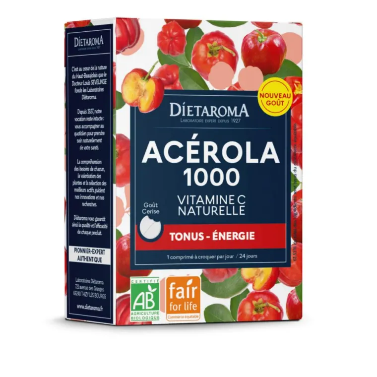 | Composition | Pour un comprimé de 2 600 mg : poudre de jus d’acérola* (Malpighia glabra) (1000 mg soit 150 mg de vitamine C = 187% des AR**), sucre de canne*, sucre de coco*, agent de charge : gomme d’acacia, antiagglomérant : amidon de riz*, arôme de cerise.