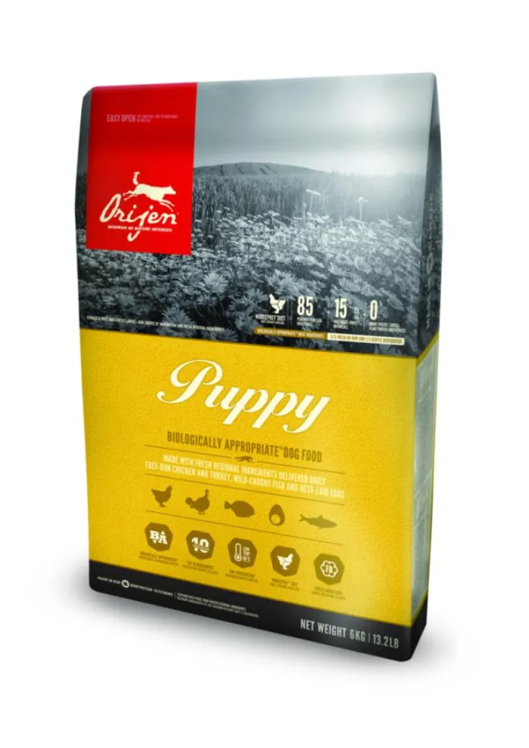 | Composition | ORIJEN Puppy regorge de protéines et de matières grasses naturelles provenant de véritables viandes fraîches, y compris du poulet et de la dinde élevés en liberté, de poissons sauvages et d’oeufs entiers pondus au nid. Tous sont inclus dans des proportions WholePrey TM très nutritives.Viande de poulet fraîche (11%), viande de dinde fraîche (7%), oeufs entiers frais (6%), hareng entier frais (6%), foie de poulet frais (5%), plie entière fraîche (5%), foie de dinde frais (5%), coeur de poulet frais (4%), coeur de dinde frais (4%), cou de poulet frais (4%), poulet (déshydraté, 4%), dinde (déshydratée, 4%), maquereau entier (déshydraté, 4%), sardines entières (déshydratées, 4%), hareng entier (déshydraté, 4%), gras de poulet (4%), huile de hareng (2%), lentilles rouges, pois verts, lentilles vertes, pois chiches, pois jaunes, fibre de lentilles, haricots pinto, haricots ronds blancs, os et cartilage de poulet (1%), foie de poulet (lyophilisé), foie de dinde (lyophilisé), citrouille entière fraîche, courge musquée entière fraîche, courgettes entières fraîches, panais entiers frais, carottes fraîches, pommes red delicious entières fraîches, poires bartlett entières fraîches, chou vert frisé frais, épinards frais, feuilles de betteraves fraîches, feuilles de navet fraîches, varech brun, canneberges entières, bleuets entiers (myrtilles), baies de saskatoon entières, racine de chicorée, curcuma, chardon marie, racine de bardane, lavande, racine de guimauve, fruits de l’églantier. ADDITIFS NUTRITIONNELS (par kg) : Chélate de zinc : 100 mg. Additifs zootechniques : Enterococcus faecium NCIMB10415: 600×10ý6 CFU.Composition : Protéines 38 % Matières grasses 20 % Cendres brutes 8 % Fibres brutes 5 % Humidité 12 % Calcium / Phosphore 1,4 % / 1,1 % Omega-6 / Omega-3 3 % / 1,1 % ADH / AEP 0,35 % / 0,25 % Glucosamine 1500 mg/kg Chondroïtine 1200 mg/kg Répartition des calories : Énergie métabolisable : 4000 kcal/kg (520 kcal pour une tasse de 250 mL/120 g). Répartition des calories pour maintenir une excellente forme: 38% de protéines, 17% de légumes et de fruits, et 45% de matières grasses.