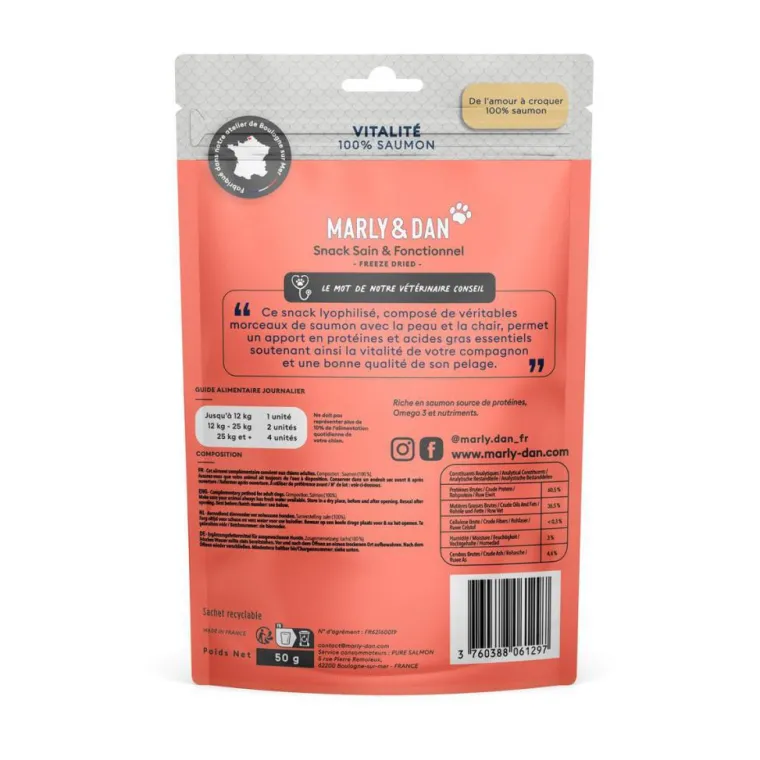 | Composition | 1 ingrédient unique : 100% morceaux de saumon (chair et peau)