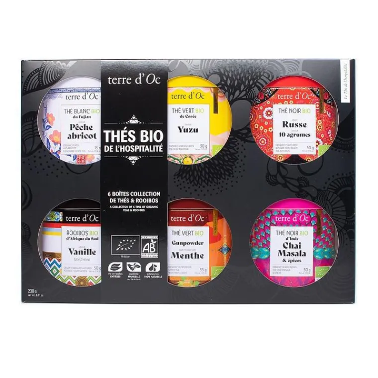 | Composition | Thé blanc bio du Fujian saveur pêche abricot?: thé blanc Bai Mu Dan* (Chine) 80%, arôme naturel*, arôme naturel de pêche avec autres arômes naturels*. Rooibos bio d’Afrique du Sud saveur vanille : Rooibos*(1) 95% (Afrique du Sud), arôme naturel de vanille avec autres arômes naturels*. (1) Commerce équitable contrôlé Fair For Life. » Thé vert bio Gunpowder aux feuilles de menthes?: thé vert gunpowder* (Chine) 60%, feuilles de menthe* 40%. Thé vert bio yuzu de Corée : thé vert Daejak*(Corée du Sud) 75%, extrait de yuzu* 8%, morceaux de citron*, extrait de citron*, extrait de limette*. Thé noir bio goût russe saveur 10 agrumes?: thé noir* (Chine) 81%, agrumes 7% (cubes d’orange*, cubes de pamplemousse*, cubes de citron*), arôme naturel de bergamote*, arôme naturel de mandarine*, arôme naturel d’agrumes*, arôme naturel de limette*, arôme naturel de citron vert*, arôme naturel de yuzu*, arôme naturel de fleur d’oranger*. Thé noir bio d’Inde Chaï Masala : Mélange bio d’épices et de thé noir d’Inde, Chai Masala. Ingrédients?: épices* 41% (cannelle*, cardamome*, gingembre*, poivre noir*, clou de girofle*, baies roses*), thé noir* 39% (Inde), orange*, extrait d’épices*, extrait de cannelle*.