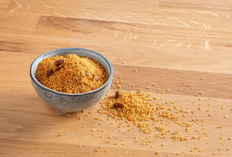 | Composition | Semoule complète de BLE dur*raisins secs*carotte*huile d’olive vierge extra*flocons de pois chiches*épices* 2,6%(paprika*cannelle*clous de girofle*poivre noir*muscade*cumin*curcuma*gingembre*piment*)oignon*ail*persil*
