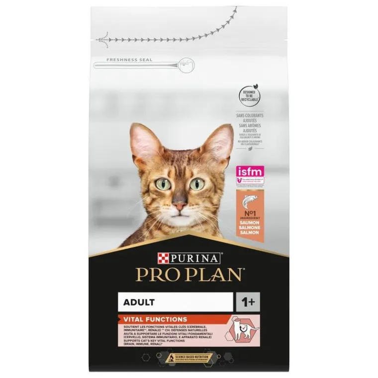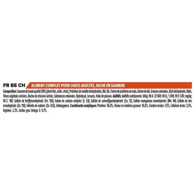 | Composition | Saumon (18 %), riz, gluten de maïs, protéines de volaille déshydratées, maïs, blé, graisse animale, œufs déshydratés, racine de chicorée déshydratée* (2 %), gluten de blé, sels minéraux, concentré de protéines de pois, hydrolysat, levures. *prébiotique naturel.