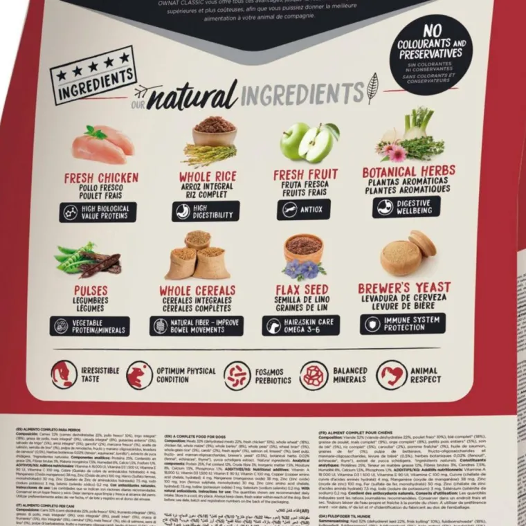 | Composition | COMPOSITION : Viande 32% (viande déshydratée 22%, poulet frais* 10%), blé complet* (18%), graisse de poulet, maïs complet* (9%), orge complet* (8%), petits pois entiers* (5%), son de blé* (5%), riz complet* (5%), caroube* (2%), pomme fraîche* (1%), huile de saumon, graines de lin* (1%), pulpe de betterave, fructo-oligosaccharides et mannane-oligosaccharides, levure de bière* (0,5%), herbes botaniques 0,02% (fenouil*, échinacée*, thym*), extrait de yucca schidigera. *Ingrédients naturels ADDITIFS/KG : Additifs nutritionnels : Vitamine A 18 000 UI, Vitamine D3 1 500 UI, Vitamine E 90 UI, Vitamine C 100 mg, Cuivre (chélate de cuivre d’acides aminés hydraté) 4 mg, Manganèse (oxyde de manganèse) 38 mg, Zinc (oxyde de zinc) 100 mg, Fer (sulfate de fer, monohydraté) 30 mg, Zinc (chélate de zinc d’acides aminés hydraté) 7,5 mg, Iode (iodure de potassium) 3 mg, Sélénium (sélénite de sodium) 0,2 mg. Contient des antioxydants naturels.