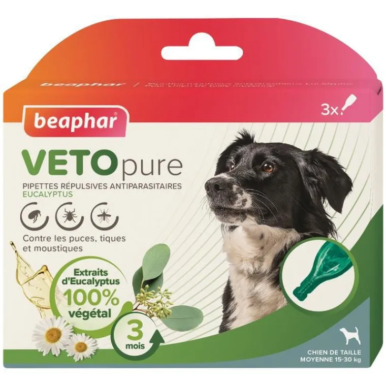 | Conseils d’entretien | Ouvrir la pipette en rompant son extrémité et appliquer son contenu sur le cou du chien, derrière les oreilles. Sur les chiens blancs, le produit peut provoquer une coloration temporaire du pelage à l’endroit du dépôt. L’action optimale des pipettes nécessite quelques jours. Ce produit contient des extraits végétaux, il est possible que quelques tiques restent accrochées sur les animaux. Pour cette raison, la transmission de maladies infectieuses (Piroplasmose…) ne peut pas être exclue