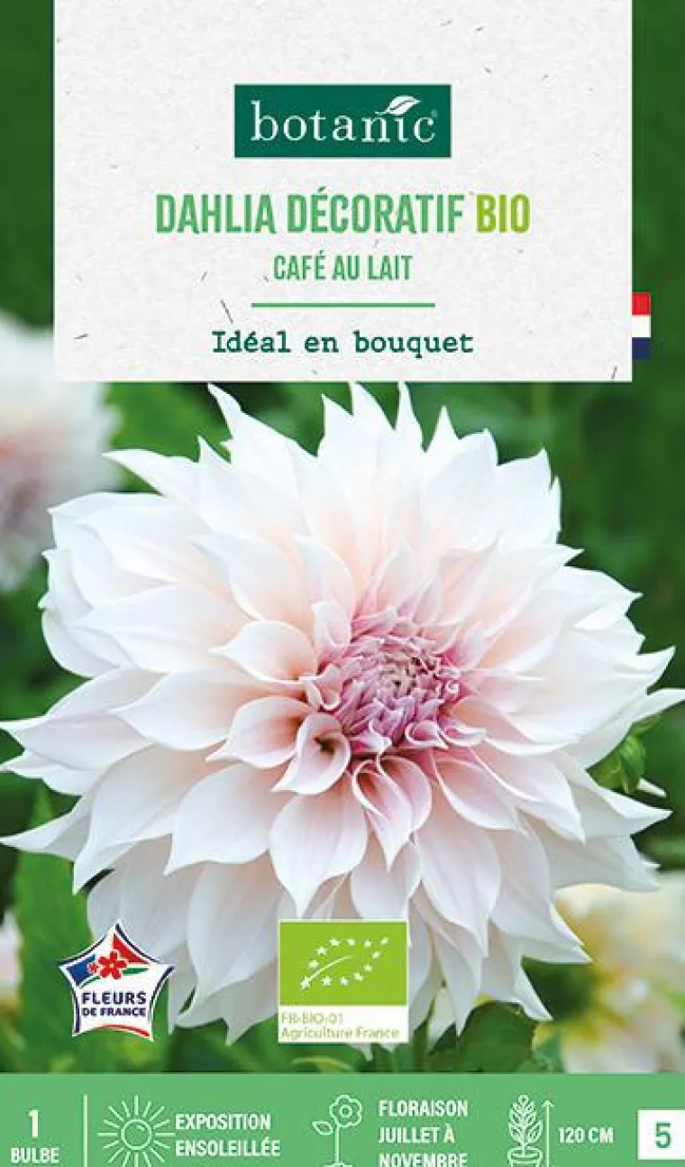 | Conseils d’entretien | Choisissez un emplacement ensoleillé dans un sol riche et bien drainé. Les bulbes de dahlias se plantent après les fortes gelées. Dans un sol ameubli, placez un tuteur au centre d’une cuvette de Ø 40 cm puis le bulbe et recouvrez-le de 5 cm de terre. Dès que la végétation s’étoffe, arrosez de préférence au pied sans mouiller le feuillage, le soir pour éviter l’évaporation. Dès le début de l’été, surveillez l’apparition de ravageurs. Arrosez copieusement à la plantation puis régulièrement pendant la végétation avec une solution d’engrais, sans mouiller le feuillage. A l’apparition des jeunes plantules, protégez des limaces et escargots. Pour des plantes plus trapues et florifères, pincez-les en début de végétation : coupez l’extrémité de la tige dès l’apparition de la quatrième feuille. Éliminez les fleurs fanées pour prolonger la floraison. Dès les premières gelées, arrachez les tubercules et remplacez-les par des bulbes à floraison printanière : tulipes, narcisses, crocus… Pailler votre sol pour le protéger et limiter le développement d’adventices.
