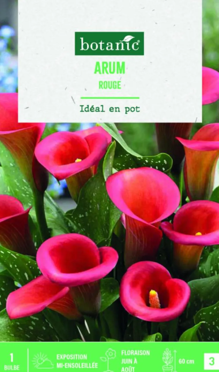 | Conseils d’entretien | Plantez les bulbes à environ 10 cm de profondeur et 40 cm de distance, à mi-ombre, dans un endroit chaud et humide à la fois, au bord d’un bassin par exemple. Arrosez abondamment pendant la végétation puis parcimonieusement pendant la période de floraison. N’hésitez pas à faire des apports réguliers d’engrais universel organique liquide pour favoriser la floraison. Pour les hivers doux, les arums peuvent rester en place. Pour les hivers plus rudes, arrachez les bulbes après floraison, faites-les sécher et conservez-les dans un endroit frais et sec pour les replanter au printemps suivant. La date de floraison et hauteur varient selon le sol, l’exposition et le climat.