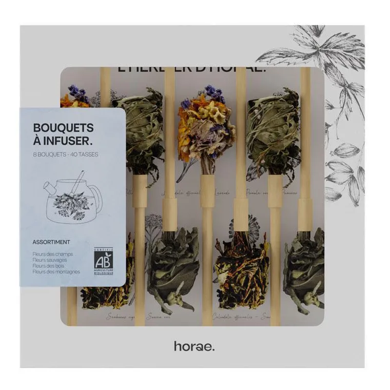 | Composition | Fleurs sauvages – Ingrédients : fleur de lavande* (Lavandula officinalis), feuille de mélisse* (Melissa officinalis), fleur de bruyère* (Calluna vulgaris), fleur d’aubépine* (Crataegus laevigata/monogyna), fleur de primevère* (Primula veris). Fleurs des champs – Ingrédients : fleur de mauve* (Malva silvestris), fleur de souci* (Calendula officinalis), fleur de bleuet* (Centaurea cyanus), fleur de lavande* (Lavandula officinalis), fleur de millefeuille* (Achillea millefolium), fleur d’immortelle des sables* (Helichrysum arenarium), fleur de monarde* (Monarda didyma). Fleurs des montagnes – Ingrédients : feuille de sauge* (Salvia officinalis), fleur d’origan* (Origanum vulgare), fleur de thé grec des montagnes* (Sideritis scardica), feuille de menthe poivrée* (Mentha piperita). Fleurs des bois – Ingrédients : feuille de grande ortie* (Urtica dioica), fleur de sureau noir* (Sambucus nigra), feuille de prêle des champs* (Equisetum arvense), feuille de fraisier* (Fragaria vesca), fleur de bruyère* (Calluna vulgaris). Infusions sans théine. La proportion de chaque ingrédient peut varier. *Ingrédients issus de l’agriculture biologique