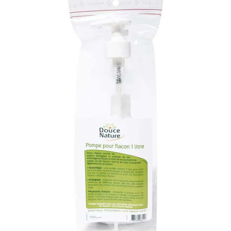 | Conseils d’entretien | Manipuler la pompe avec les mains propres et la nettoyer à chaque changement de flacon 1 litre Douce Nature avec un coton imbibé d’alcool bio pour limiter la prolifération des bactéries.