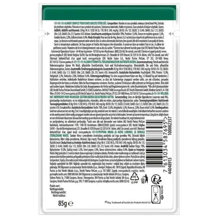 | Conseils d’entretien | Pour un chat de 4 kg, donner 3 pochons/jour en 2 repas séparés au moins. Les besoins individuels peuvent varier et le rationnement doit être adapté pour maintenir votre chat à son poids de forme idéal. Servir à température ambiante. De l’eau propre et fraîche doit toujours être disponible.