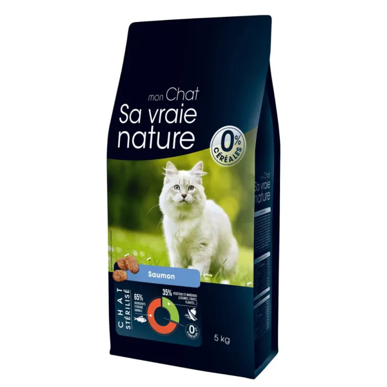 | Composition | Chair de saumon déshydratée (35%), pois (18%), protéines de saumon hydrolysées(10%), chair de truite déshydratées (10%), pommes de terre (8%), pommes séchées (7%), graisse de poulet (conservée par des tocopherols, 7%), aromes de poulet hydrolyses (2%), huile de saumon (1%), levure de bière (1%), mannan- oligosaccharides (150 mg/kg), fructo- oligosaccharides (100 mg/kg), basilic (100 mg/kg), thym (100 mg/kg), romarin (100 mg/ kg), canneberges (100 mg/kg), myrtilles (100 mg/kg), Yucca schidigera (80 mg/kg).