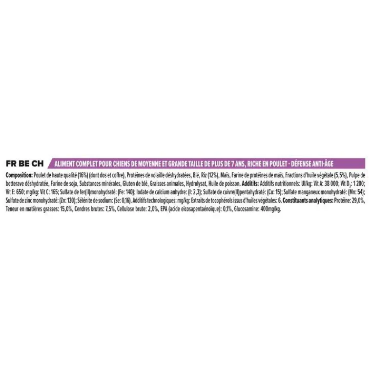 | Composition | COMPOSITION : Poulet (15%), protéines de volaille déshydratées, blé, riz (12%), maïs, gluten de maïs, fractions d’huile végétale, pulpe de betterave déshydratée, farine de soja, sels minéraux, gluten de blé, graisse animale, hydrolysat, huile de poisson.